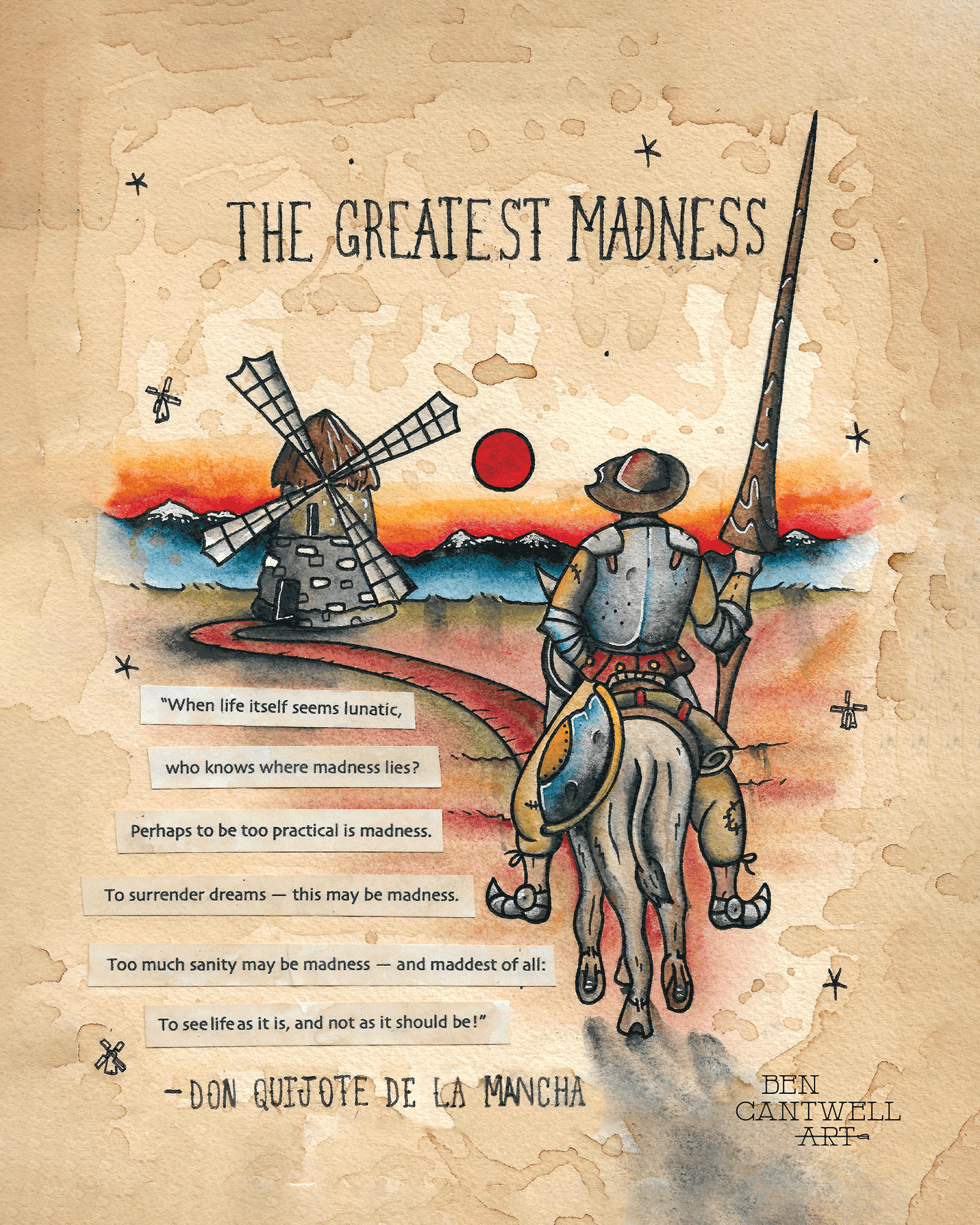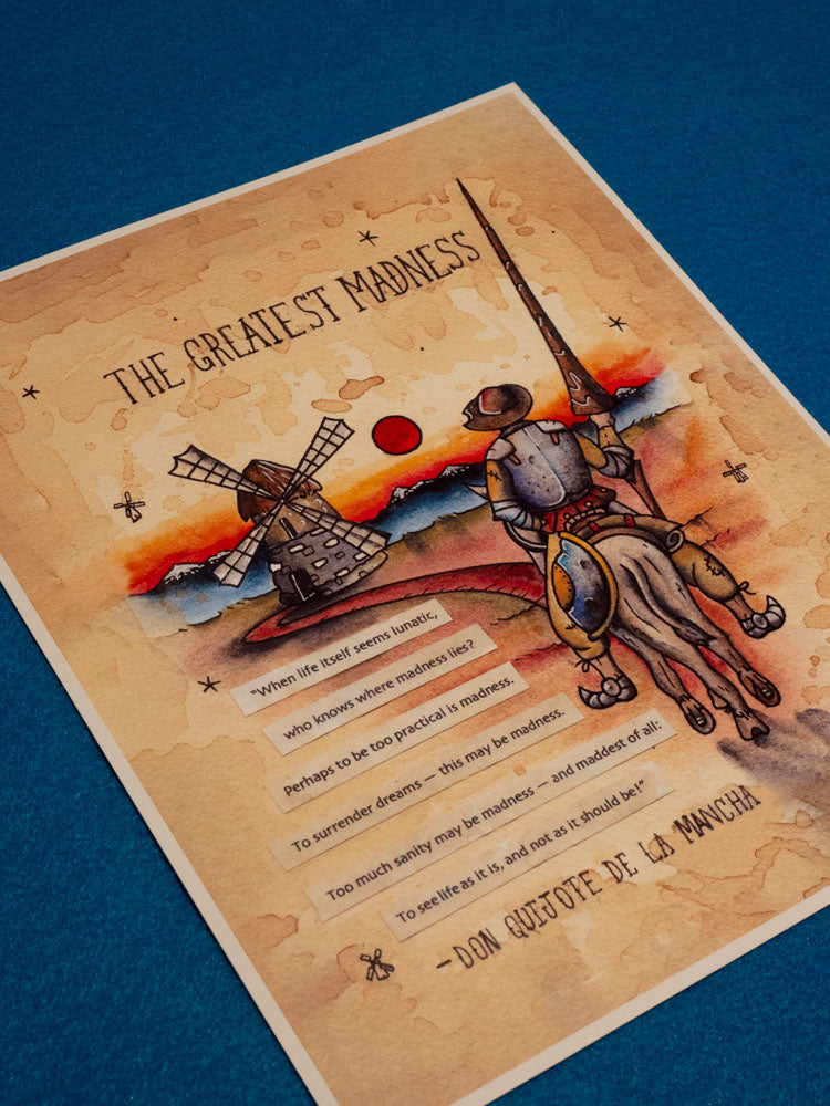 Get this piece with the text “When life itself seems lunatic, who knows where madness lies? Perhaps to be too practical is madness. To surrender dreams — this may be madness. Too much sanity may be madness — and maddest of all: to see life as it is, and not as it should be!” -Miguel de Cervantes Saavedra, Don Quixote