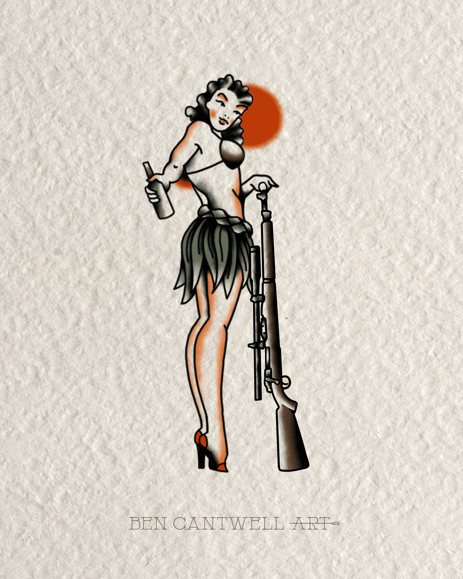 This American traditional style pin up is holding one of the weapons that helped the Marines and Soldiers win the Second World War. Complete with her weapon, coconut bra, grad client and Gung-Ho attitude, winning the war is no problem!